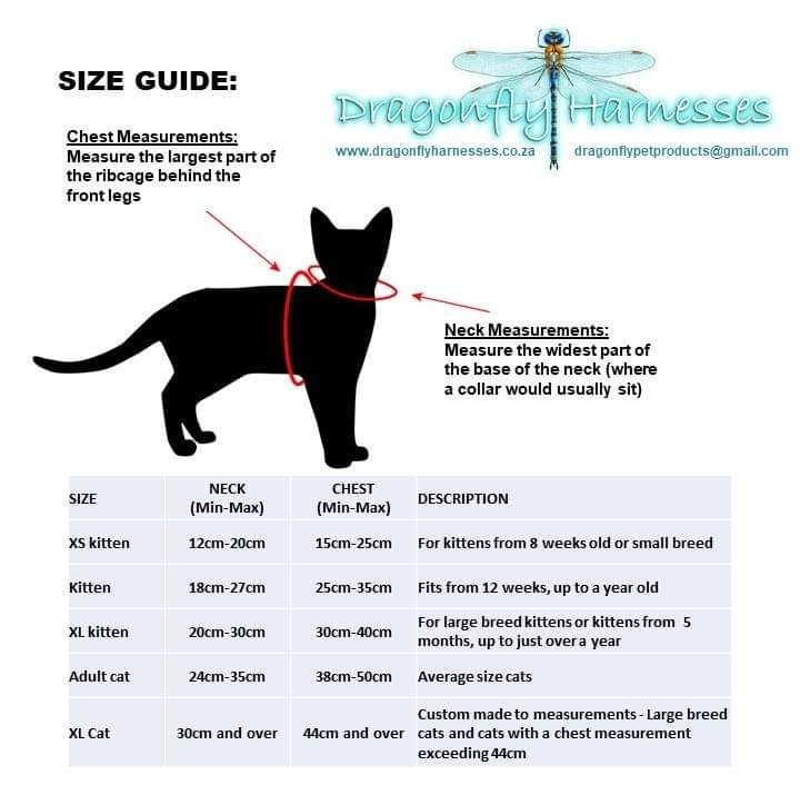 To ensure that you are getting the correct size for your cat and a perfectly fitting handmade harness, please see the guide and ensure that you measure around your cat’s neck area and also measure the chest area, just in behind the front legs.