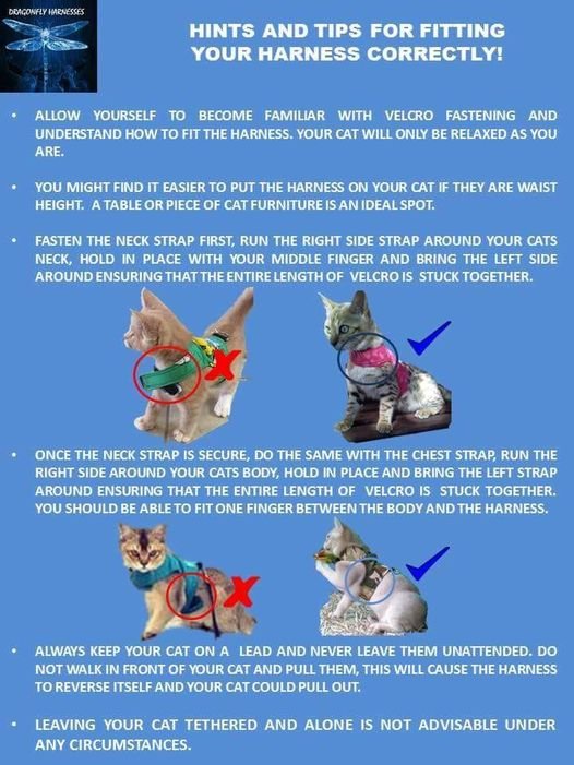 First time owners of Dragonfly Harnesses must allow for the cat to get used to wearing their new harness in the safety of their own home first to ensure that they are comfortable with it. They may flop down on their side and not move, they may walk with an arched back, stiff legs or other unnatural posture for a little bit. This is not uncommon and should not cause concern - it is merely your cat feeling out the unfamiliar and deciding how they feel about it.